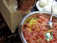 Из мяса, вареного картофеля и лука приготовим фарш. Добавим в него одно яйцо, соль и перец. Все хорошо перемешаем. |
