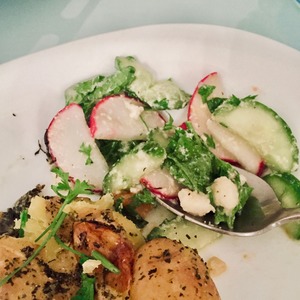 Описание: Салат от от Джейми Оливера. Представьте себе запеченный нежный молодой картофель в сочетании с ярким хрустящим и свежим салатом из редиски и огурчиков. Джейми просто удивительно гармонично умеет сочетать простые продукты! Заходите и угощайтесь весенним салатиком!