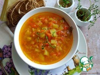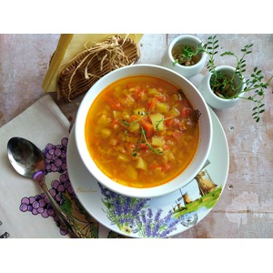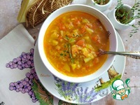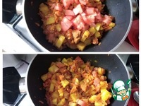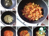 Паралельно делаем заправку к супу в сотейнике или сковороде. Наливаем масло. Я буду использовать оливковое, которое можно заменить на подсолнечное. Греем его. Выкладываем 2 зубчика чеснока, раздавив их плоской стороной ножа. Через минуту чеснок убираем, он отдал свой аромат маслу. Выкладываем лук мелко порезанный. Золотим его. Очередь натёртой моркови. Убавляем огонь на плите, накрываем сотейник крышкой и томим минуты 3-5. Присыпаем всё специями, а это карри, имбирь и я добавлю ещё немного перца кайен, хотя он в карри присутствует. Перец кладите по желанию. Перемешиваем. Картофель режем мелким кубиком и отправляем в сотейник, чтобы он пропитался соками и ароматами содержимого, следом отправляем морковь из бульона, тоже мелко её порезав. Томим под крышкой ещё минут 5. |