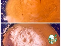 Добавить масло и кефир. Взбить тесто около 30 секунд. Затем всыпать муку и разрыхлитель, взбиваем тесто около минуты. Тесто густое, с ложки не стекает. |