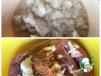 В фарш добавить все специи, лук натереть на крупной тёрке, чеснок пропустить через пресс. У батона снять корочку и залить мякиш холодной водой (1 стакан) минут на 10. |