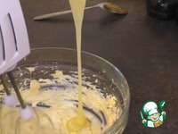 Готовим крем. Сливочное масло взбиваем, пока оно не побелеет. Тоненькой струйкой, продолжая взбивать, добавляем сгущенное молоко. |