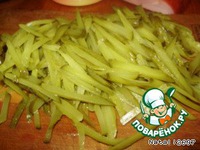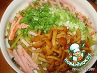 По рецепту шел репчатый лук, но я заменила его зеленым. С грибов слить маринад. Все смешать и заправить сметаной + майонез. Посолить и поперчить. Как видите ничего сложного, но вкусно! |