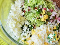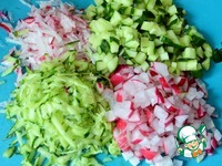 1/3 часть огурцов и редиски натереть на тёрке, остальное нарезать мелким кубиком. Соединить с зеленью. |