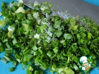 Лук и укроп порезать, добавить 1 ч. л. соли, порубить ножом до выделения сока. Переложить в 3-х л. кастрюлю ( не меньше). |