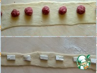 Тесто разделить на несколько частей, скатать каждую часть в длинную колбаску, затем ее раскатать. Разложить начинку, у меня фарш и брынза. |