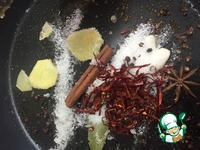 На сухую, разогретую сковороду, кладём специи, имбирь, высыпаем сахар. Всё хорошо перемешиваем. Сковорода должна быть глубокой, удобнее будет работать с мясом. |
