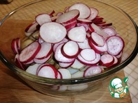 Редиску нарезать также кружками и отправить в миску к картофелю. |