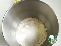 В чаше соединить просеянную муку, опару, сливочную смесь, растительное масло и сахар (45 гр.). Перемешать. |