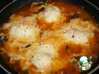 Нарезаем яйца пополам и укладываем в соус. Я добавила еще листиков базилика. |