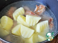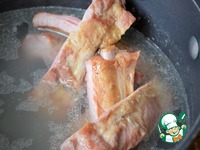 Рёбра вымыть, нарезать. Залить водой, дать закипеть, 30 минут варить на медленном огне. |