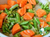Лук и морковь обжарить на растительном масле. Добавить фасоль, обжарить 5 минут, огонь средний. |
