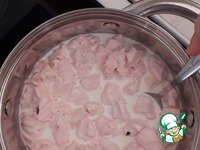Зефир поместить в кастрюлю, предварительно измельчив. Добавить безлактозное молоко и нагревать, постоянно помешивая. |