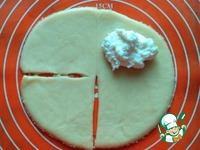 Мысленно делим круг на 4 сектора. Но делаем пока только два надреза, чуть не доходящих до центра. На противоположный сектор выкладываем творожную начинку, примерно, 1-1.5 ч. л. |
