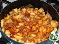 5. Отправляем картофель к капусте, туда же томатную пасту и воду. |