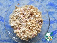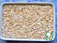 В миску пересыпаю воздушный рис, оставшиеся 90 граммов маршмеллоу и перекладываю смесь из расплавленного суфле с маслом. Все быстро перемешиваю, так как смесь начинает быстро застывать. |