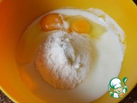 В просеянную муку добавить кефир, яйца, сахар. Размешать. |
