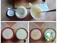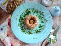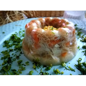 Разобрала отварное куриное мясо руками на волокна. Поместила в посуду, добавила два отваренных кусочка моркови, порезанной мелко. Поперчила и выдавила зубчик чеснока. Перемешала и разложила по формам. 250 мл бульона процедила, подогрела его до Т-60 С и развела в нём желатин. Желатин разводите, следуя указаниям на упаковке. Залила формочки с курицей, разделив бульон пополам. Нужно, чтобы сверху осталось место для бульона с хреном, примерно 2 см высоты в форме. Поставила застыть заливное в холодильник. |
