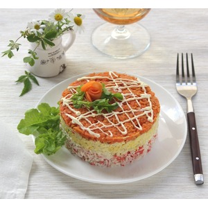 Описание: Приготовьте этот нежный салат и создайте в семье праздник. Этот салат у нас всегда пользуется неизменным успехом, доступные продукты, демократическая цена, легкость приготовления и очень нежный вкус.
