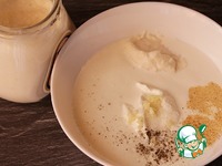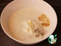 В небольшую миску влить сливки, добавить сметану, соль, чёрный молотый перец, кайенский перец и чеснок, пропущенный через пресс. |