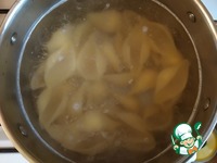 В большой кастрюле вскипятить воду, посолить и отварить конкильони. Когда будут готовы, слить воду и остудить в холодной воде (чтобы остановить процесс). |