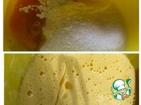 Яйца взбить до бела с ванилином и сахаром. Добавить масло и сок, взбить секунд 10.