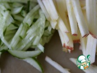 Огурцы и яблоко трём или режем тонкой соломкой. Сбрызгиваем яблоко соком лимона. |