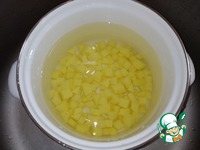 Для начала подготовим все нужные продукты. Нарезаем чищеный картофель средним кубиком и заливаем двумя литрами холодной проточной воды, ставим на огонь закипать. |