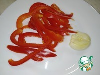 Чеснок 1-2 зубчика придавливаем тыльной стороной ножа. Красный сладкий перец нарезаем соломкой |