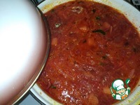 За 2-3 минуты до окончания готовки мы засыпаем нарезанный соломкой красный сладкий перец, солим, перчим. Также лавровый лист, раздавленный чеснок и мелко рубленную зелень. |