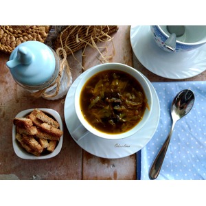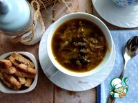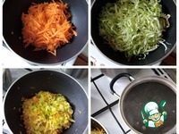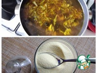 Пока варятся грибы и картофель, паралельно делаем заправку к щам из овощей. Нам понадобится кастрюля с толстым дном, в которой мы сначала будем томить овощи, а затем доваривать суп. Если нет такой, воспользуйтесь любым сотейником или сковородой для тушения овощей. Готовим овощи. Наливаем масло, греем его и выкладываем раздавленные дольки чеснока плоской стороной ножа. Через минуту, когда чеснок отдаст свой аромат маслу, его можно убрать. Я сделаю это чуть позже. Далее выкладываем лук, золотим его. От капусты я отделила целые листья и тонко их нашинковала. Длинными не нужно их резать, чтобы удобно было есть и брать в ложку. |