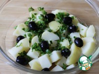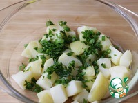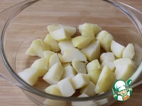 Охлажденный картофель очистить и нарезать на двольно крупные кусочки. |