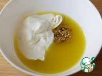Оливковое масло и лимонный сок взбить до однородной эмульсии, добавить горчицу, йогурт и приправить по вкусу солью. |