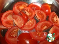 Смазать дно формы маслом. Нарезать помидор на шайбы и уложить первым слоем. |