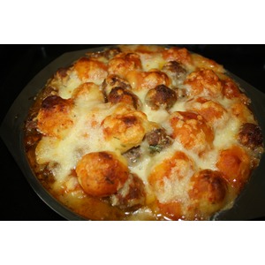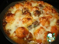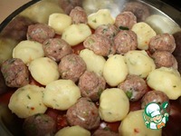 Затем кладем в перемешку фрикадельки. |