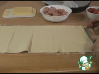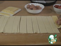 Сыр лучше покупать нарезанный слайсами, так будет удобнее. Нарезаем сыр по ширине полосок теста, выкладываем на тесто. |