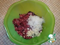 В глубокую миску к фаршу добавить натёртый на крупной тёрке лук. И мелко порезанные три дольки чеснока. |