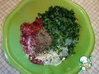 Добавить мелко порезанную зелень, паприку, молотый кориандр, чёрный перец. Посолить по вкусу и хорошо перемешать. |