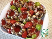 Переложить картофель в глубокую форму для запекания. Большими кусочками порезать болгарский перец и дольками помидор, заполнить пустые места между картофелем. |