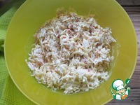 Добавляем, пропущенный через пресс чеснок и майонез. Соль я не добавляла, т. к. и сыр, и ветчина, и майонез в достаточной степени соленые на мой вкус. |