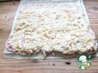 Из указанного количества ингредиентов получается два больших рулета. Трем на терке сыр, яйца и крабовые палочки. |