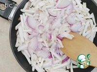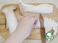 Нарезаем тонкой соломкой грибы Эринги, лук можно нарезать полукольцами. |