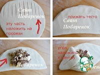 Вторую часть теста наложить на прорези, прижать. Выложить начинку на середину. Один край теста наложить на начинку к центру. Хорошо прижать концы теста. |