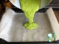 - К взбитым яйцам со шпинатом, частями добавляем просеянную муку с разрыхлителем, замешиваем тесто при помощи венчика аккуратными движениями. Тесто получается по консистенции как бисквитное. |