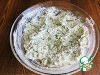2. Готовим начинку. - В миске смешиваем творог, сметану, нарубленный укроп, чеснок (пропускаем через пресс), соль. |