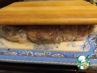 После варки выложить рулет на плоское блюдо, и положить груз (я кладу разделочную доску и ставлю на верх 1.5 литровую кастрюлю с водой.). Оставить под грузом в прохладном месте (холодильник) на ночь. |