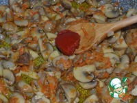 Добавить томатную пасту, перемешать и прогреть 30 сек. На этом этапе можно добавить раздавленный зубчик чеснока. |