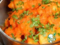 И полить картофель. Добавить сахар, соль и перцы. хорошо перемешать. Тушить постоянно перемешивая 5 минут. |