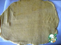 Раскатать тесто на листе пергамента в тонкий пласт. Аккуратно переложить лист с тестом на противень. |