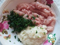 В миску положить фарш, лук, соль, специи и измнльченную зелень. |